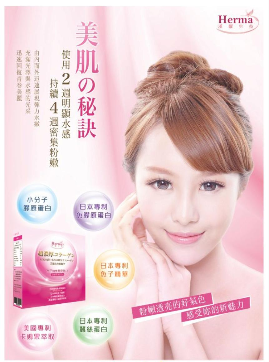 漢耀Herma在2014年推出肌膚保濕產品「日本專利70000mg超濃厚魚子精華膠原蛋白」,運用四種專利成份,包含日本專利魚子精華、日本專利蠺絲蛋白與美國專利卡。一週能立即感受到水嫩,由內而外迅速展現彈力水嫩,充滿光澤與水感的光采,迅速恢復青春美麗。